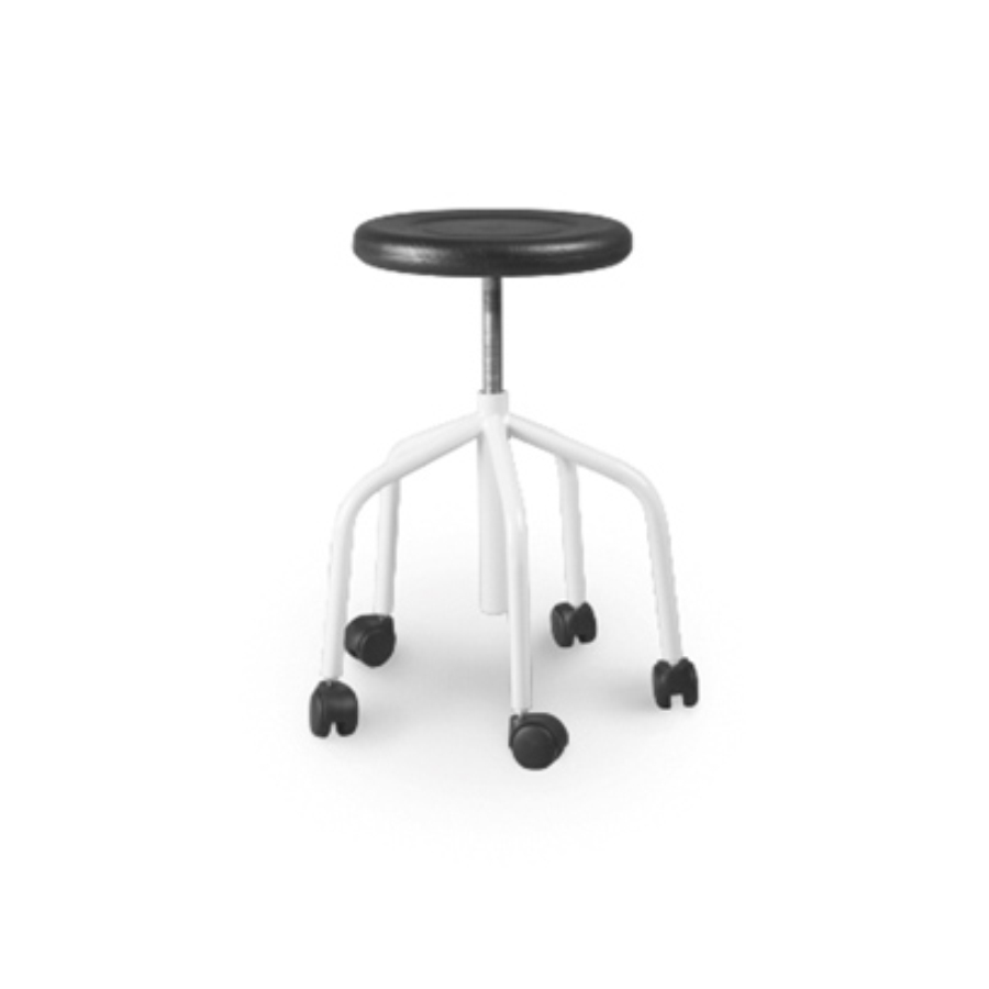 Estrutura em tubo de aço, com 5 pés, com rodas, pintura epoxy, com assento de 300 mm de diâmetro em madeira envernizada, poliuretano ou forrado a napa, regulável em altura através de fuso.