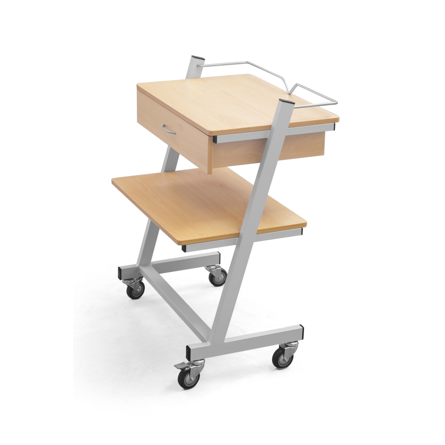 Estrutura em tubo de aço, pintura epoxy, com tampo e prateleira em chapa de aço e varandim de protecção no tampo superior, inclui 2 tinas amovíveis em aço inox, com1 gaveta, com 4 rodas.