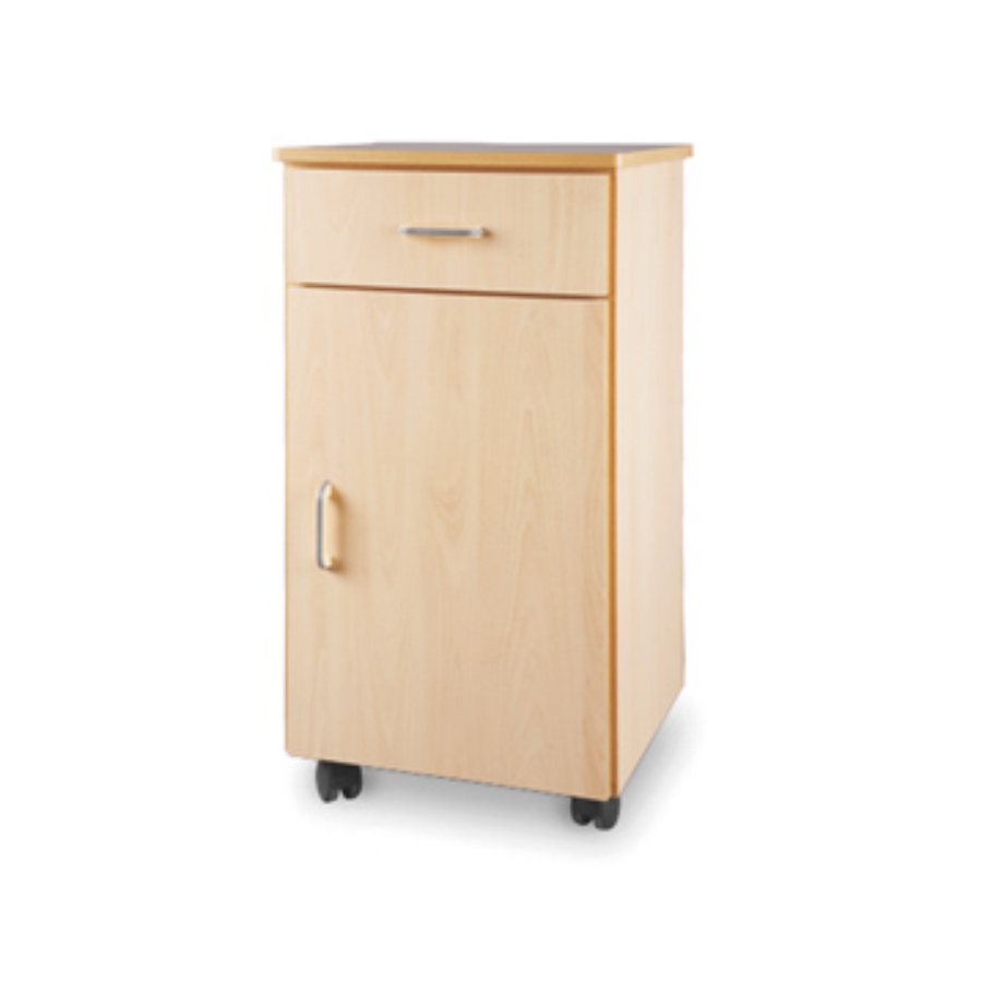 Estrutura em termo-laminado de faia, gaveta, cacifo com prateleira com rodas.